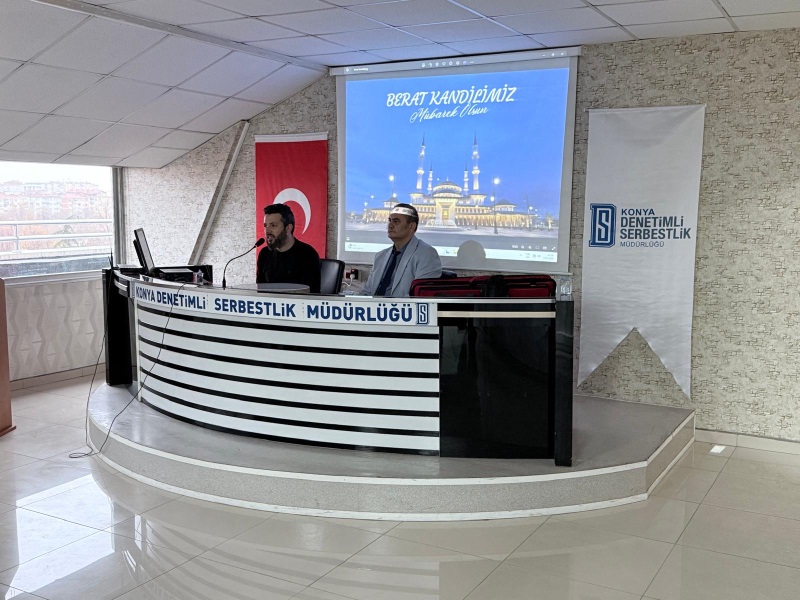 Berat Kandili dolayısıyla kurumumuz bünyesinde Manevi Rehberlik Birimi tarafından program düzenlendi. Düzenlenen programda Din Hiz. Uzmanı Mustafa Uslu tarafından yapılan Kur’an-ı Kerim tilavetinin ardından Diyanet İşleri Başkanlığı tarafından hazırlanan sinevizyon izletildi. Ardından Cezaevi Vaizi Dr. Murat Eroğlu tarafından Berat Kandili’nin anlam ve önemi üzerine bilgilendirme sohbeti yapıldı. Daha sonra ney ve ses sanatçısı misafirlerimizden Savcılık görevlisi Mehmet Eken ve Meram Belediyesi görevlisi Yunus Emre Elma tarafından ney eşliğinde ilahi dinletisi yapıldı. Katılımcılar, kandilin birlik, beraberlik ve manevi atmosferinde bir araya geldi.